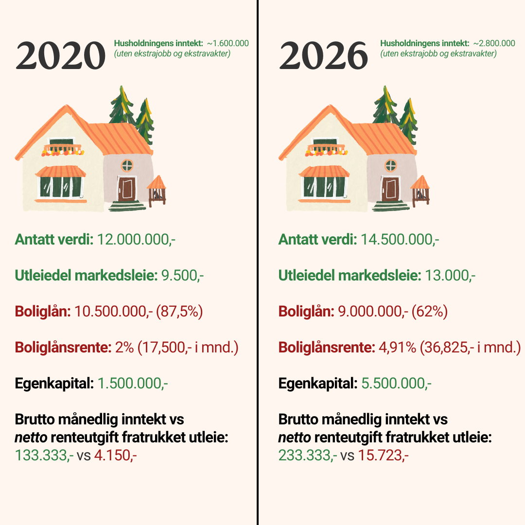 Spoler vi så fram til i dag, er situasjonen helt anderledes fra 2020. Vi har en komfortabel økonomi, på tross av at de absolutte boligutgiftene fortsatt er svært høye. Vi har nå begge nådd toppen av den ordinære ansiennitetsstigen, og husholdningsinntekten er stabil og sterk. Vi kan dog ikke forvente en tilsvarende lønnsvekst framover.